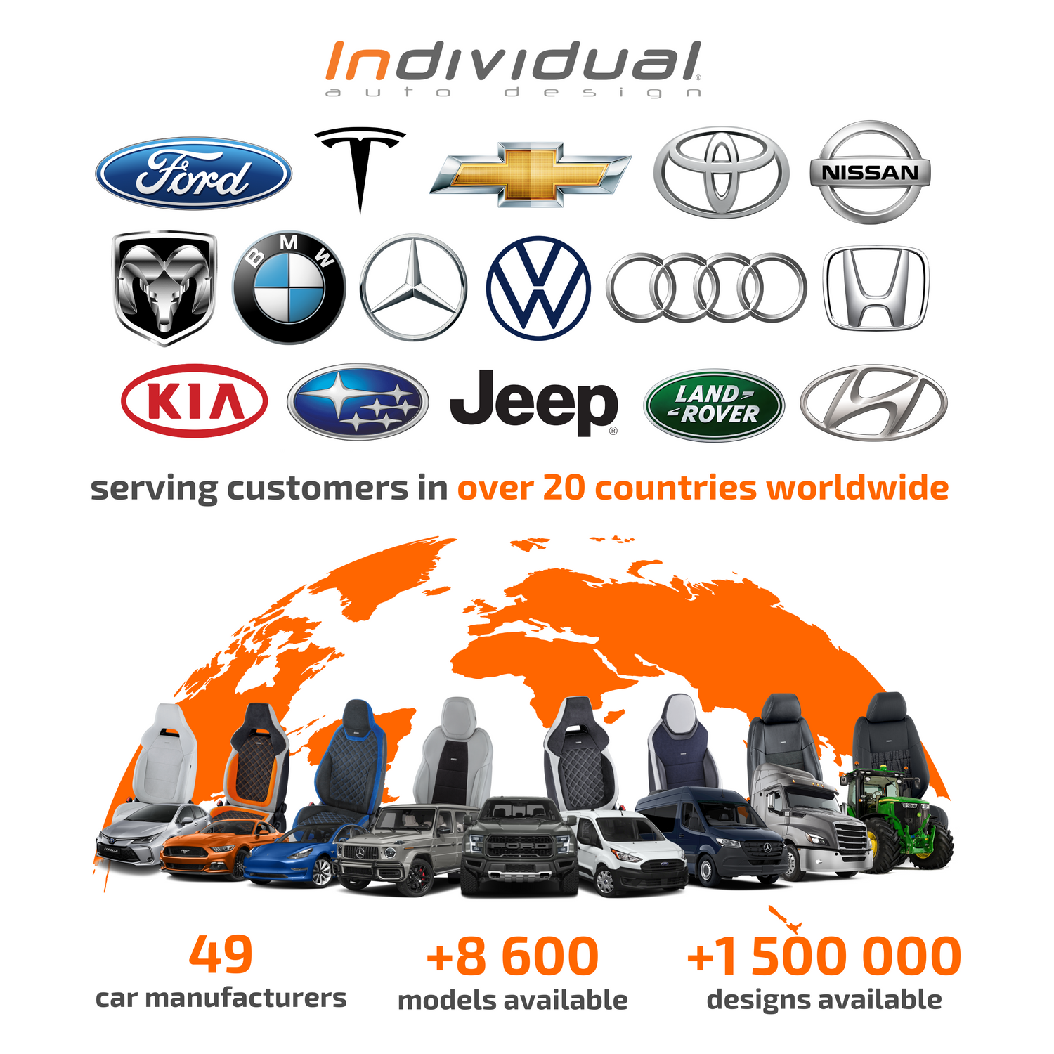 At Individual Auto Design, we're the pros in custom seat skins, with more than 30 years in the game and serving customers in over 20 countries worldwide. We've got more options than you can shake a gear stick at, covering 49 car brands and over 8,600 vehicle models. And with over 1.5 million color and material combos, you've got endless choices to suit your taste.